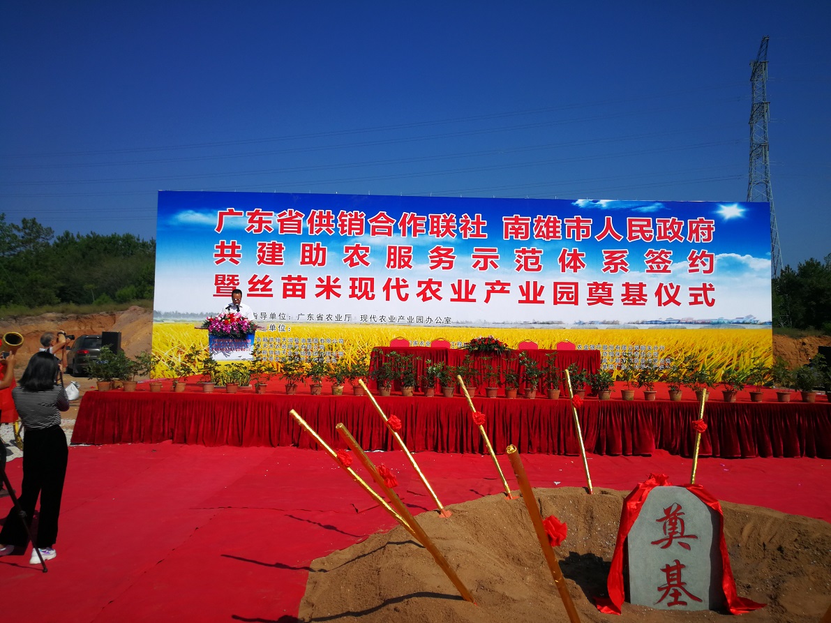 9月30日上午,long8 与南雄市政府共建助农服务示范体系签约暨丝苗米现代农业产业园奠基仪式在南雄市珠玑镇举行。省社党组成员、理事会副主任陈容秋,南雄市委副书记、市长林小龙出席仪式并致辞。