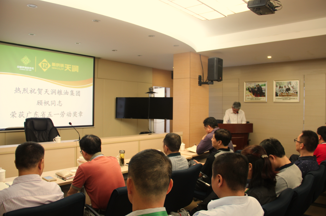 2016年5月3日,天润粮油集团召开员工大会,祝贺顾帆同志荣获“广东省五一劳动奖章”。公司领导班子成员出席会议,总部全体员工参加会议,会议由公司工会主席陈志荣主持。