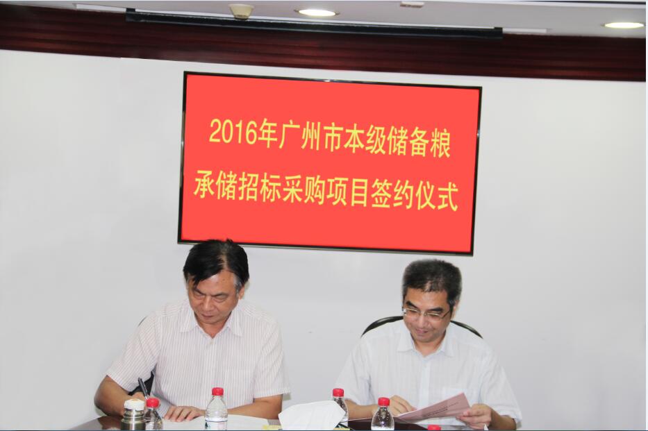 7月26日,广州市粮管中心举行2016年新增市本级储备粮承储招标采购中标合同签订仪式,粮管中心主任朱文健、副主任杨建、农业发展银行广州营业部副总经理王红湛、粮管中心各部门负责人及各中标企业代表出席签约仪式。