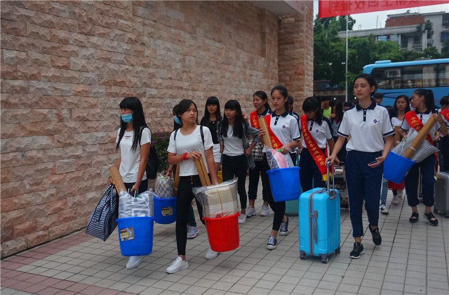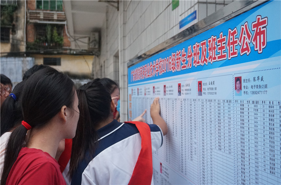 在湛江市各大车站,我校设立接站处,安排老师、学生志愿者和专车迎接前来报到的新生及家长,一句“您是报到的新生吧”的问询,一句“我来帮您拎行李吧”传递着温情的帮助,他们坚守岗位,对应车次无遗漏的把每一位新生及家长安全送至学校。报到注册处排起了新生及家长“长龙”,班主任们忙碌地填写、审核学生注册信息,耐心解答学生和家长的疑问。在老师们和志愿者们的协助下,每一位新生都妥善地安排到事先编排好的宿舍。