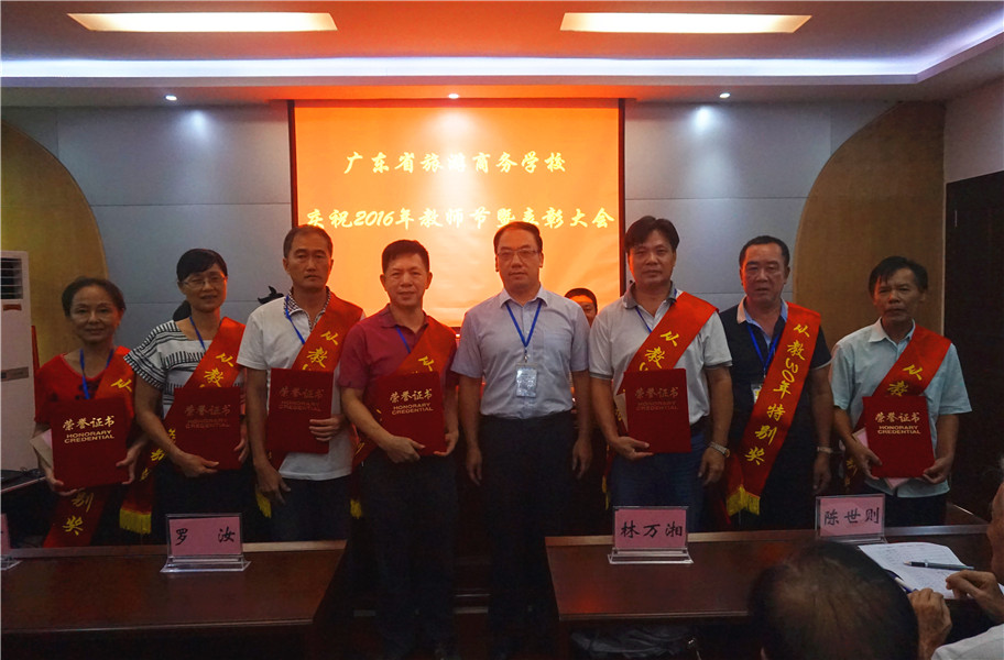 校长助理何国雄在会上宣读《关于2016年“先进教师”“先进班主任”表彰的决定》,授予余嘉静、黄宇媚、张宜琼、李侃等4位老师为2015-2016学年度“优秀教师”荣誉称号;授予廖蕴阳、谢茂进、廖明孚等3位老师为2015-2016学年度“优秀班主任”荣誉称号。校长助理卢尚秀宣读《关于表彰从教30周年以上教育工作者的决定》,授予陈绍钧、廖蕴阳、陈子定、冯成毅、卢尚秀、李筱燕、杨志生等7位同志“从事教育工作30周年特别荣誉奖”。李明龙校长和全国东副校长分别为获奖老师颁奖。