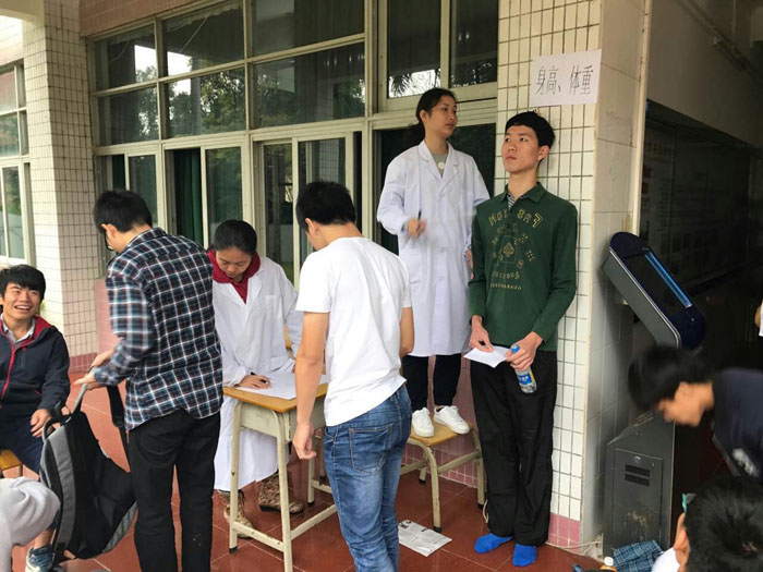 体检地点分三个区域,一号教学楼9间课室、羽毛球馆及学生第一食堂前门。体检项目主要有:男女内科、外科检查,身高、体重测量,抽血,视力,辨色力,血压及胸部X光透视。体检采用班级分批轮候的方法,没轮到的班级则按照课程表正常上课。