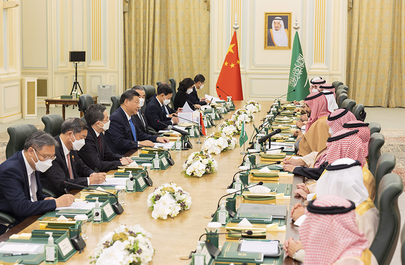 当地时间12月8日中午,国家主席习近平在利雅得王宫同沙特王储兼首相穆罕默德举行会谈。新华社记者 岳月伟 摄