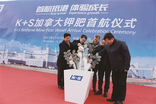 11月15日上午,装载3万余吨白求恩钾肥的“大圆冠军”轮停靠在烟台港码头。“首航抵港,体验成长”——K+S加拿大钾肥首航仪式在烟台港码头举行。德国钾盐集团(K+S)董事、集团副总裁Otto Lose博士,德国钾盐集团中国区董事总经理郭延亮博士,烟台港集团总裁纪少波,中农集团控股股份有限公司总经理苏泽文,烟台众德集团总经理王其选出席仪式,国内知名钾肥贸易企业、复合肥生产企业,以及流通企业代表一同见证了K+S加拿大钾肥首航操作这一历史时刻。