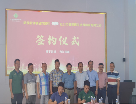 调研期间,陈林基出席了新会区供销社和江门市森环再生资源回收有限公司合作项目签约仪式。此次签约是供销社积极融入江门市生活垃圾分类回收工作的有力举措,通过推广“环保骑士”上门回收服务平台和终端智能垃圾分类回收机,大力发展“智能+互联网”垃圾分类回收模式,实现城乡生活垃圾减量化、资源化。