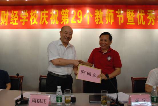 2013年9月10日,省社党组成员、理事会副主任周根旺在省社人事教育处副处长高晓滨的陪同下,出席省财经学校隆重举行的庆祝第29个教师节暨优秀教师优秀班主任表彰大会,慰问省财经学校全体教职员工并作重要讲话。省财经学校校长邓宁、副校长饶权进、彭仲文、李明龙出席了庆祝表彰大会。饶权进副校长宣读了学校《关于表彰2012/2013学年优秀教师和优秀班主任的决定》。会议由彭仲文副校长主持。