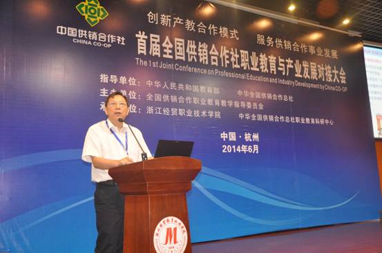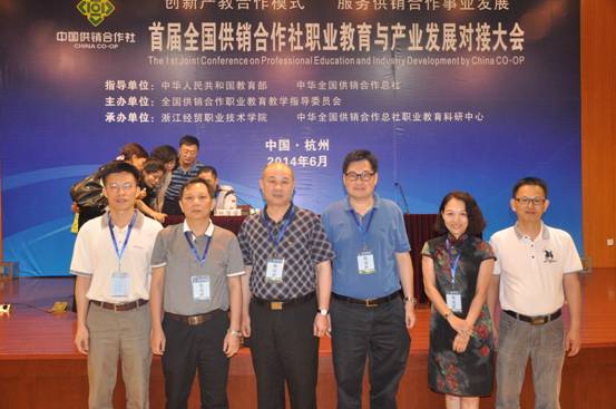 2014年6月16日,由中华人民共和国教育部、中华全国供销合作总社指导,全国供销合作职业教育教学指导委员会主办的“首届全国供销合作社职业教育与产业发展对接大会”在浙江经贸职业技术学院举行。教育部职成司副司长谢俐、全国供销合作总社科教部部长李占海、教育部职成司刘杰处长、总社科教部阮茂荣处长、全国供销合作职业教育教学指导委员会成员、各省市供销社有关负责人、供销社系统企业领导、企业人力资源部负责人和供销系统科研院所、职业院校负责人近200人参加了大会。long8娱乐 党组成员、理事会副主任周根旺,省社人教处处长邓宁,省财经职业技术学校校长钟劲东,省电子商务技师学院校长潘朝阳、副校长朱冰,我校办公室主任林辉一行6人出席了大会。