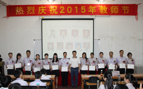 王筠镇副院长宣读了广东省人力资源和社会保障厅《致全省技工院校教职员工的慰问信》。彭仲文副院长宣读了“南粤优秀教师”表彰文件。施志君副院长宣读了学校“优秀班主任”及“优秀教师”表彰决定。与会领导向受到表彰的教师进行了颁奖。
