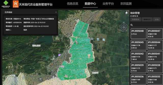 与此同时,台山农服正在搭建天禾现代农业服务管理平台,让数字化平台助力生产托管服务更高效开展。在平台地图上,台山市都斛镇坦塘村中,一片片分属不同村民的方块状托管地块,沿着宽窄不一的田埂整齐有序地排列,互相之间以深浅不一的蓝绿色区分开来,并被标注上地块名称、地址、编号、创建时间和面积等信息。