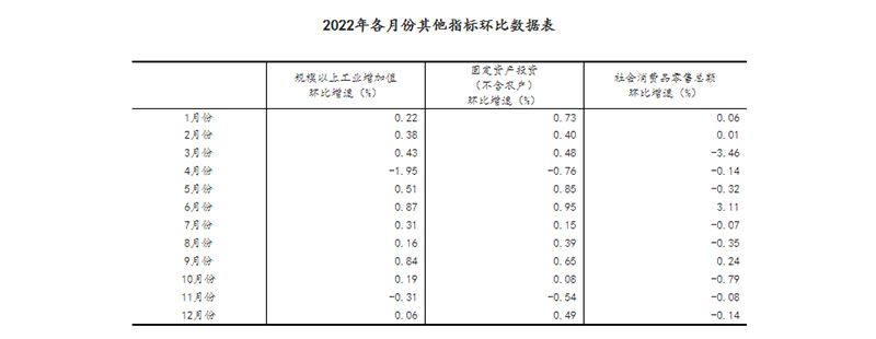 (2)根据季节调整模型自动修正结果,对近一年来各期国内生产总值、规模以上工业增加值、固定资产投资(不含农户)、社会消费品零售总额环比增速进行修订。修订结果及2022年四季度GDP环比数据、2022年12月份其他指标环比数据如下: