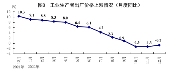 全年居民消费价格(CPI)比上年上涨2.0%。分类别看,食品烟酒价格上涨2.4%,衣着价格上涨0.5%,居住价格上涨0.7%,生活用品及服务价格上涨1.2%,交通通信价格上涨5.2%,教育文化娱乐价格上涨1.8%,医疗保健价格上涨0.6%,其他用品及服务价格上涨1.6%。在食品烟酒价格中,猪肉价格下降6.8%,粮食价格上涨2.8%,鲜菜价格上涨2.8%,鲜果价格上涨12.9%。扣除食品和能源价格后的核心CPI上涨0.9%。12月份,居民消费价格同比上涨1.8%,环比持平。全年工业生产者出厂价格比上年上涨4.1%;12月份同比下降0.7%,环比下降0.5%。全年工业生产者购进价格比上年上涨6.1%;12月份同比上涨0.3%,环比下降0.4%。