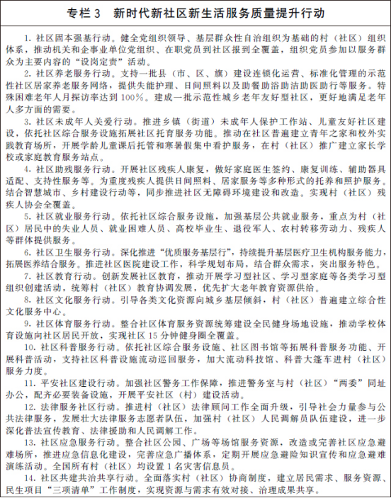 推动修订并贯彻实施《中华人民共和国村民委员会组织法》、《中华人民共和国城市居民委员会组织法》等法律法规。制定实施农村社区服务站建设标准,强化村级综合服务功能。完善社区公共服务目录及准入制度,全面规范、清理村(居)民委员会出具证明事项,推动为村(社区)减负增效,让社区工作者有更多时间服务群众。研究制定社区服务法规政策、社区服务质量综合评价体系及认证办法,完善村(社区)志愿服务、社会工作专业服务制度。探索建立养老、托育、家政、物业等领域社区服务信用管理体系。推进社区服务标准化建设,鼓励制定社区服务标准,研究制定智慧社区建设标准,加强数据安全管理和居民隐私保护。加强村(社区)服务档案建设,提高档案管理信息化水平。