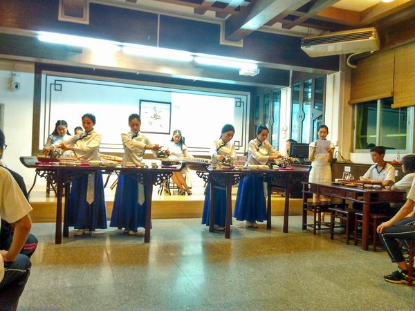 晚会先由茶艺队节目《擂茶》开场,表演者演得有声有色,给观众带来了无限欢乐,赢得了观众的喝彩。接着,由茶艺队、民乐队共同带来了《茉莉花茶》和《茉莉花》表演,动人的音乐,配上震撼的茶艺表演,感染着现场的每一个观众。吉他社的同学献上的歌曲演唱《董小姐》,赢得了观众一次又一次的掌声,将晚会推向高潮。联谊晚会在大合唱《相亲相爱一家人》的歌声中拉下帷幕。