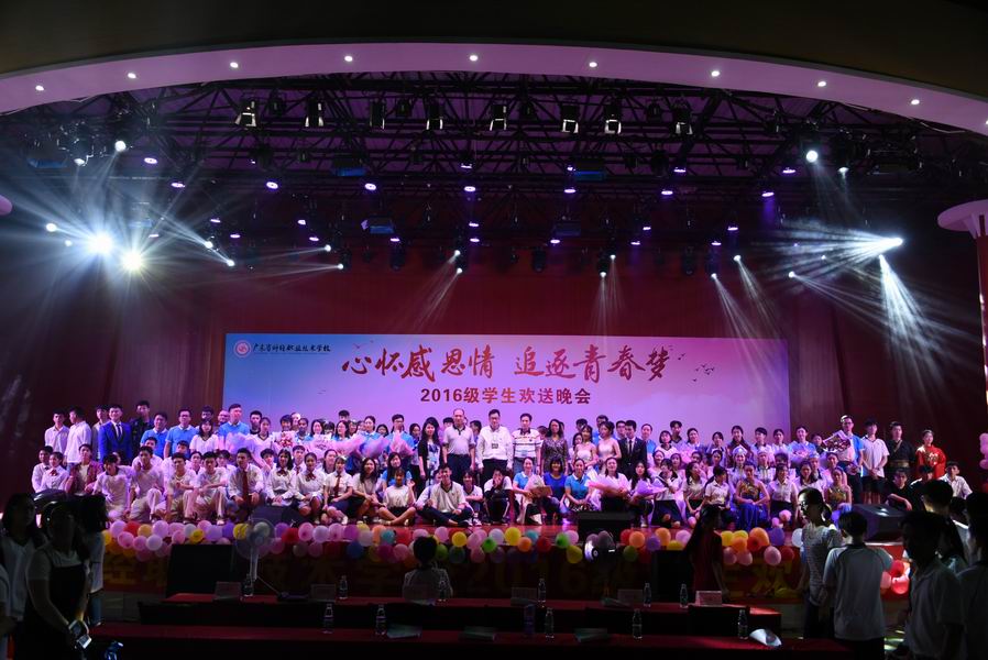 省财经学校校长、党委书记钟劲东,副校长周永生、李广乾、吴瑞明,校长助理李满玉出席欢送晚会,全程观看演出,并与2016级29位班主任以及参加演出的部分演员合影留念。