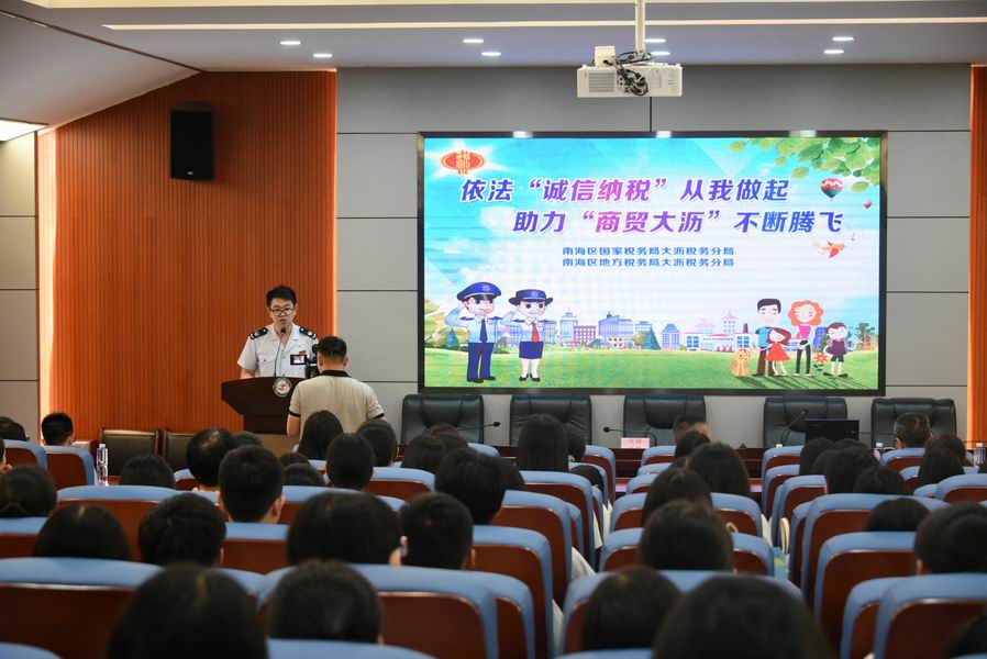 6月14日下午,省财经学校财会金融系邀请佛山市南海区大沥国地税为会计专业学生开展税收专题讲座。南海区国家税务局大沥税务分局副局长郑小毅和业务骨干,省财经学校财会金融系主任陈佩华、副主任陈英和专业骨干老师、160名会计学生到场聆听讲座。