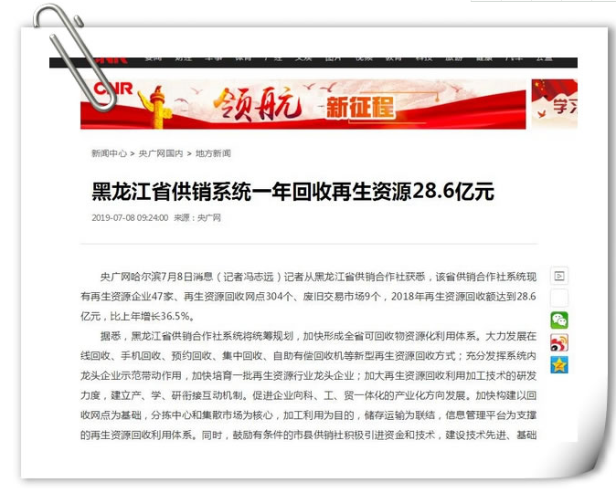 据悉,黑龙江省供销合作社系统将统筹规划,加快形成全省可回收物资源化利用体系。大力发展在线回收、手机回收、预约回收、集中回收、自助有偿回收机等新型再生资源回收方式;充分发挥系统内龙头企业示范带动作用,加快培育一批再生资源行业龙头企业;加大再生资源回收利用加工技术的研发力度,建立产、学、研衔接互动机制。促进企业向科、工、贸一体化的产业化方向发展。加快构建以回收网点为基础,分拣中心和集散市场为核心,加工利用为目的,储存运输为联结,信息管理平台为支撑的再生资源回收利用体系。同时,鼓励有条件的市县供销社积极引进资金和技术,建设技术先进、基础设施齐全、三废(废水废气固体废弃物)达标的再生资源工业园区。