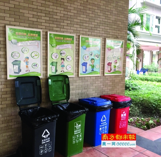 据了解,东莞实行可回收物、有害垃圾、厨余垃圾、其他垃圾的“四分类”标准,分类标识颜色分别对应蓝色、红色、绿色、黑色。