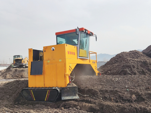 在北京市昌平区流村镇农业废弃物综合处理站,一辆翻抛机正在作业,帮助废弃物发酵成肥。